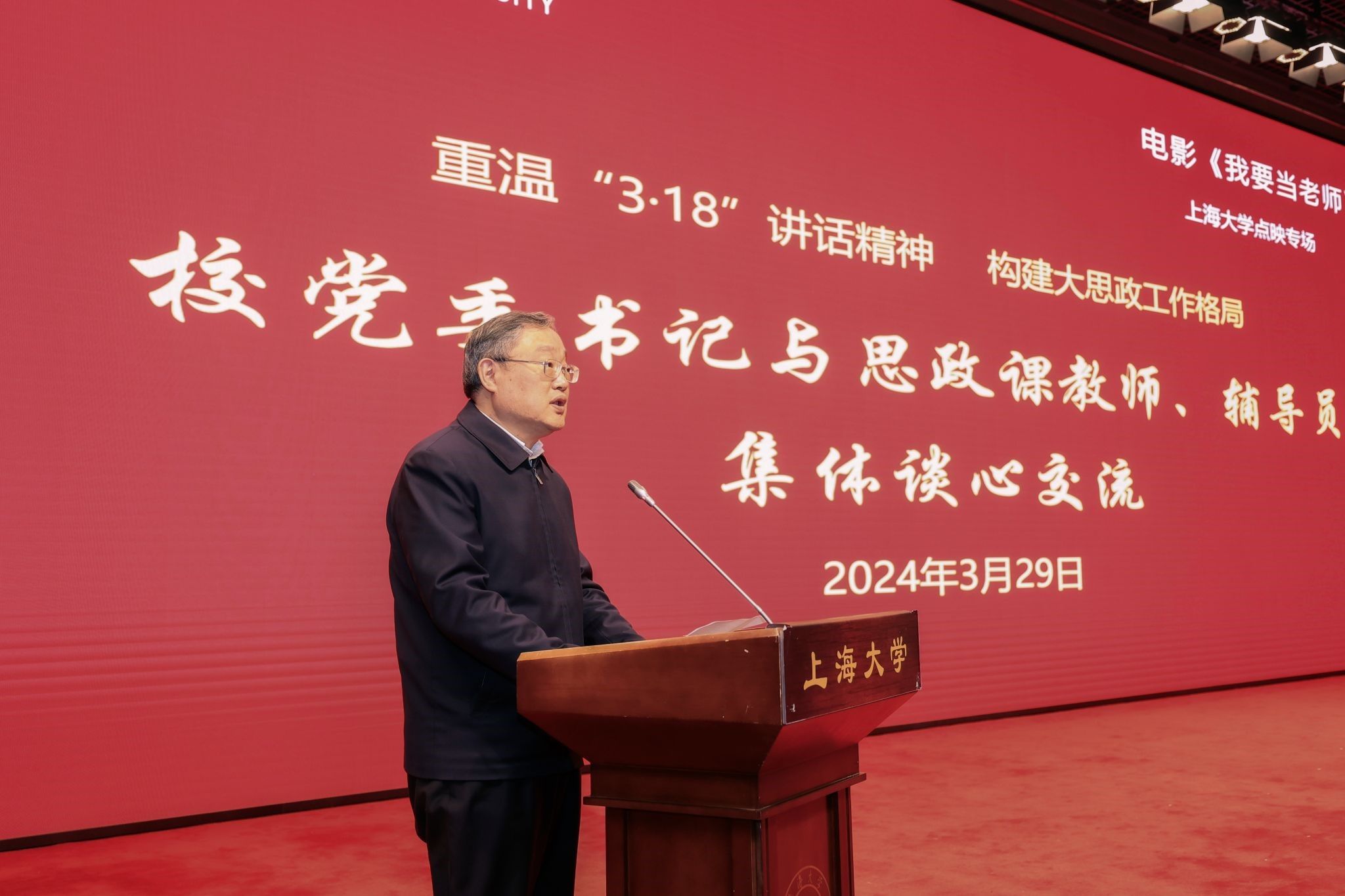 在习近平总书记“3.18”重要讲话发表五周年之际,3月15日上午,太阳成集团61999组织召开新时代高校思政课教师队伍建设研讨会。太阳成集团61999党委副书记、校长刘昌胜,上海市教委人事处处长李兴华,市教科院德育发展研究院党支部书记、副院长宗爱东等参加研讨会。刘校长强调,我校思政课教师队伍人才培养要建立科学规划,对标国家战略和政策,形成科学研究上的聚焦,做高水平项目,出高水平成果;要建立自身特色,充分发挥太阳成集团61999“红色学府”的优势资源,提高谋划与站位,更好更快更有优势地发展。 全国首部思政课题材影片《我要当老师》在太阳成集团61999点映