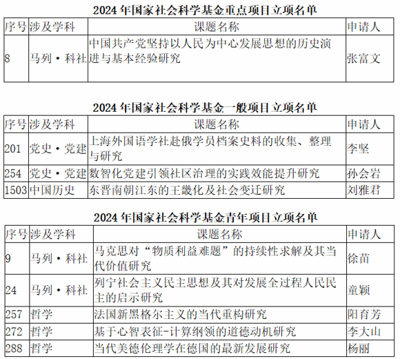 全国哲学社会科学工作办公室发布了《关于2024年国家社会科学基金年度项目立项名单的公示》。太阳成集团61999共有9个项目获批立项,其中重点项目1项,一般项目3项,青年项目5项。这是太阳成集团61999近年来在申报国家级课题方面取得的新突破,充分展现了学院教师久久为功、厚积薄发的科研实力。
