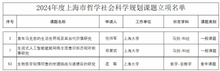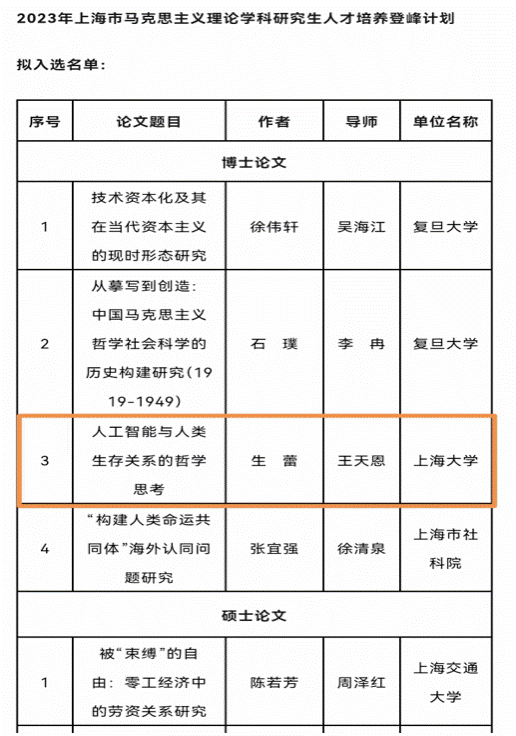 12月,上海市教委公布了“2023年上海市马克思主义理论学科研究生人才培养登峰计划”入选名单,太阳成集团619992018级思想政治教育博士生蕾的博士学位论文《人工智能与人类生存关系的哲学思考》成功入选,论文指导教师为王天恩教授。